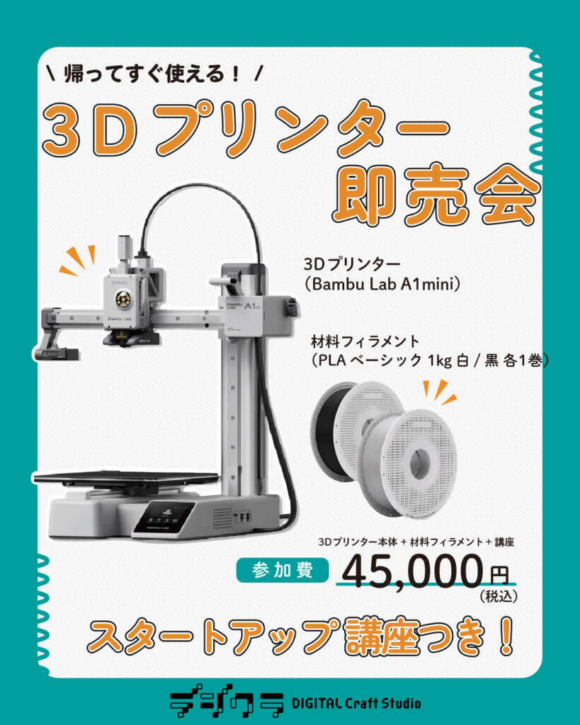 って・学んで・すぐ使える 実践重視のスタートアップ講座の参加費内には 「Bambu Lab A1 mini」本体+フィラメント2色 を含み、箱開封~組立~初期設定~基本操作~無料ソフトでの初歩データ作成まで、初心者がつまずきやすい部分を丁寧にレクチャーします。